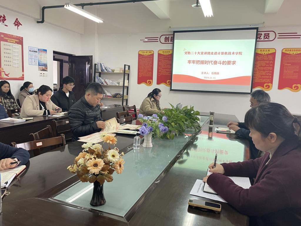 11月15日下午,谈球吧在长江楼736会议室组织开展党的二十大精神学习,公司宣讲团成员、马克思主义公司专任教师伍艳丽走进公司宣讲党的二十大精神。公司领导班子、党支部书记、辅导员、全体教师参加了此次学习。