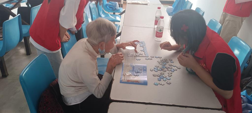 青铜树志愿服务队首先通过新媒体视频资料等方式进行宣讲,将我国“两弹一星”发展的历程清晰地展现在老人们的面前,同时陪同老人们一起完成“核力拼未来”的拼图小游戏,让整个宣讲活动变得生动有趣,让福利院里的老人们深切地感受到了这一伟大精神的深远影响。