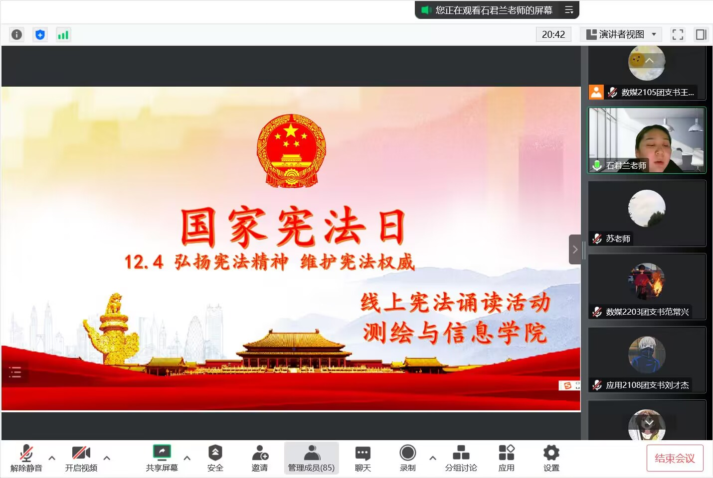 今年12月4日是我国第九个国家宪法日,也是现行宪法公布施行四十周年。为深入学习贯彻党的二十大精神、习近平法治思想,推动员工学习宣传宪法、弘扬法治精神,测绘与信息公司团委开展宪线上“宪法诵读”活动。