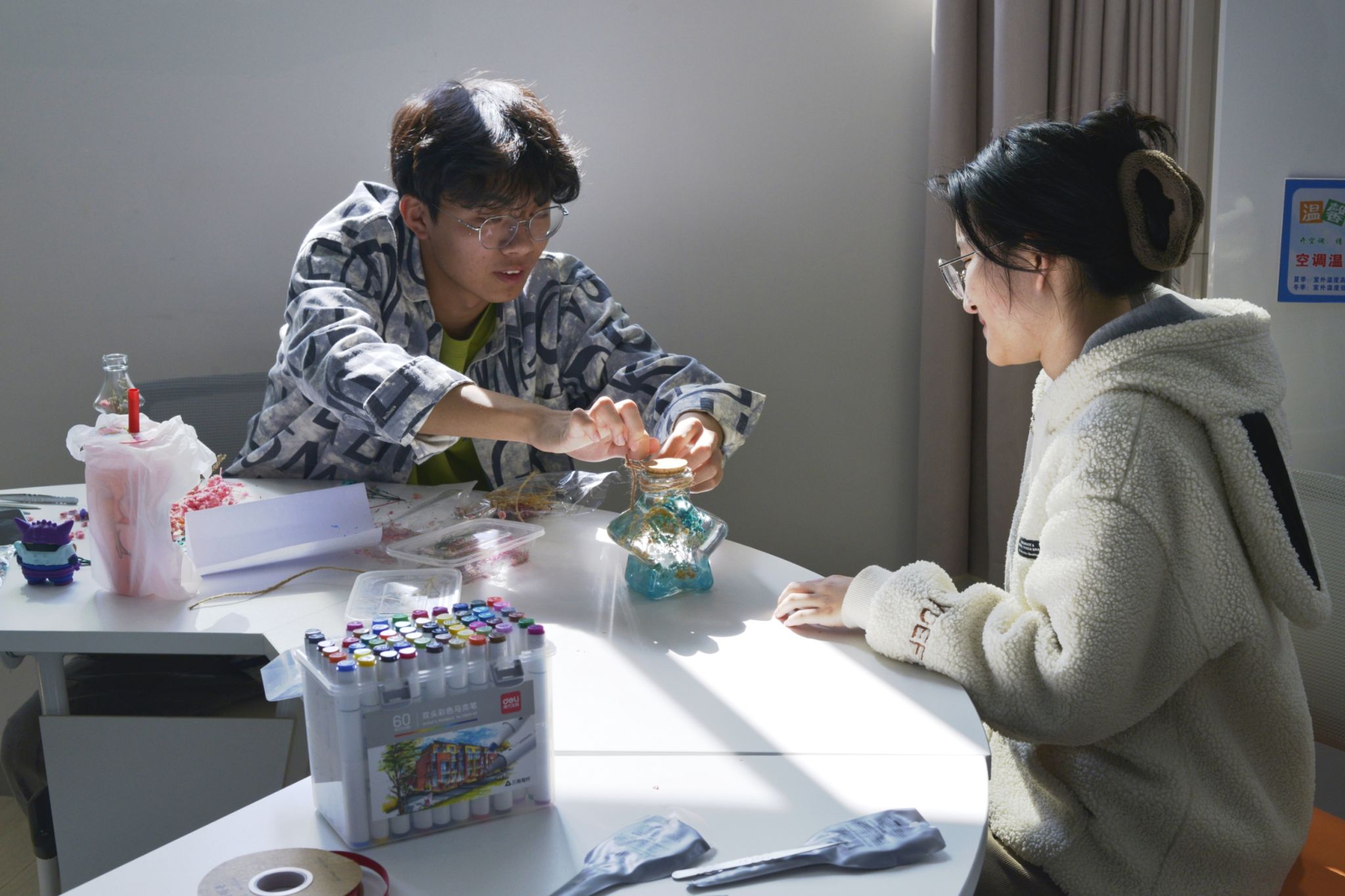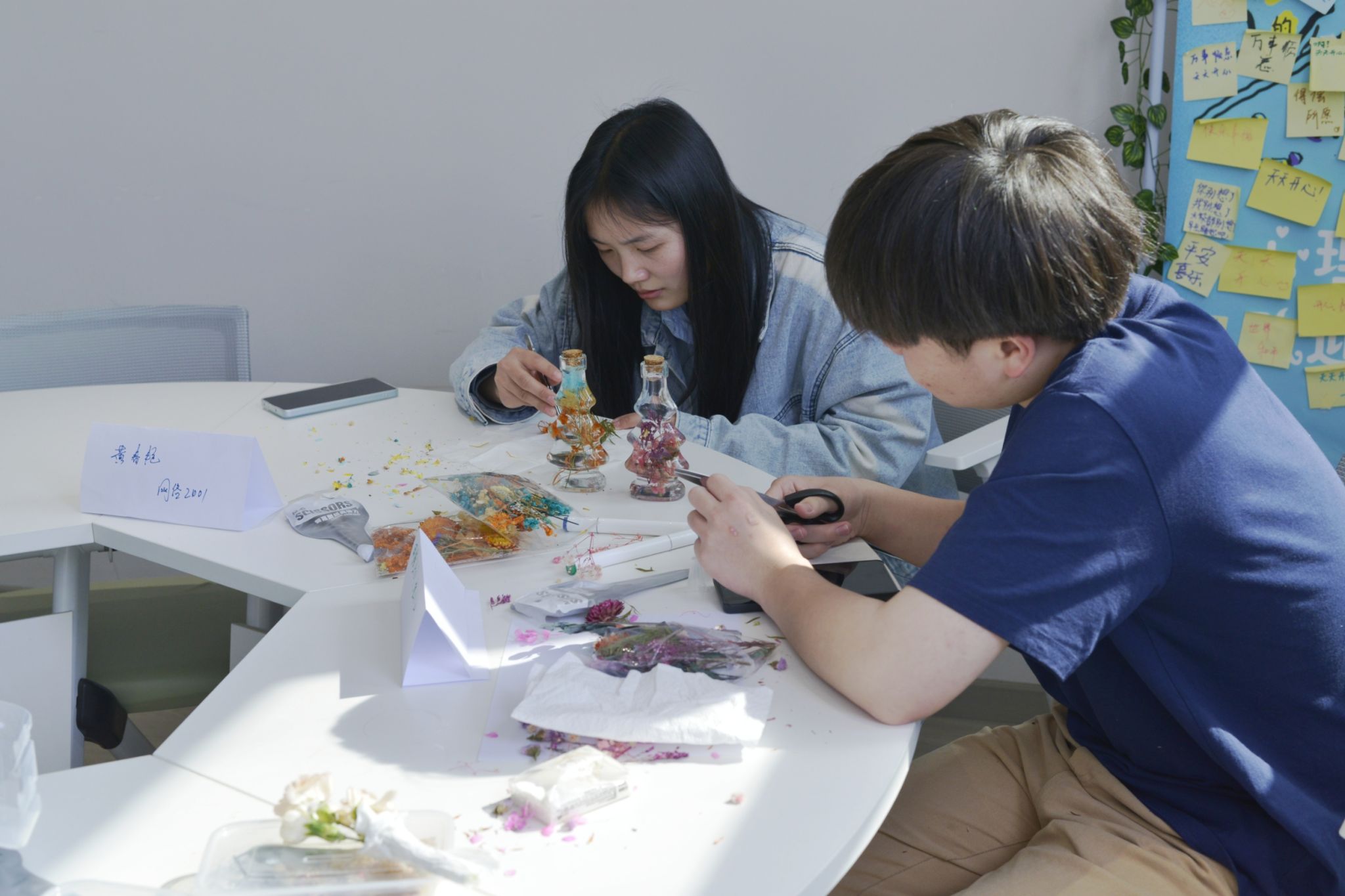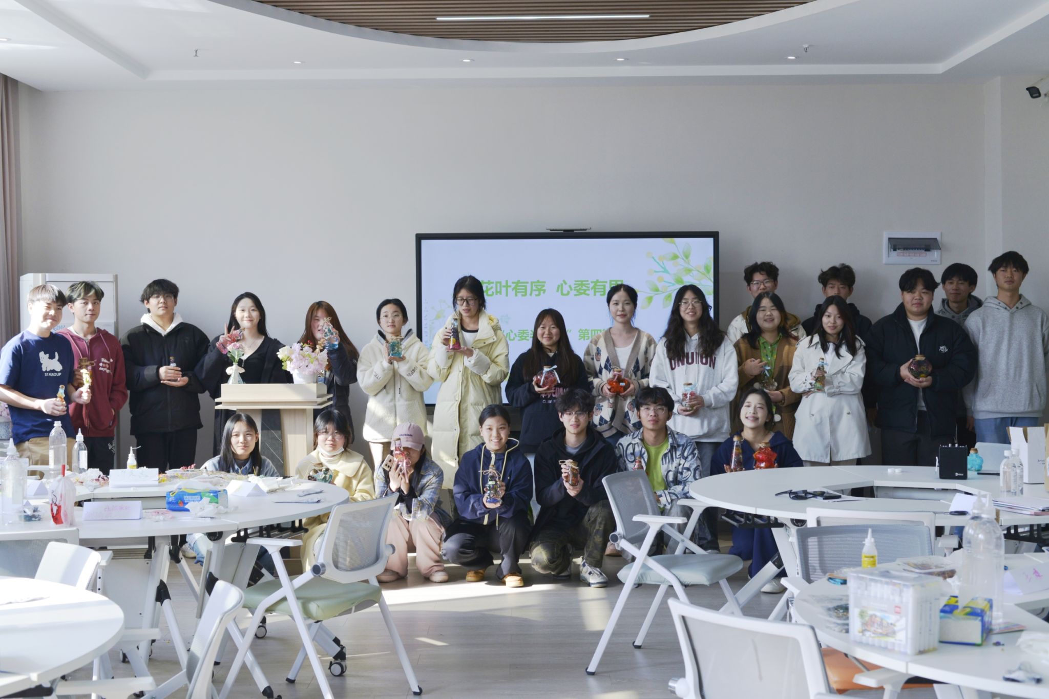 接下来,杨小玉引导同学们先从各项工作和学习生活中抽离出来,在舒缓的背景音乐中放松身心,专注于当下。紧接着,开启浮游花瓶DIY创意体验,同学们挑选心仪的花瓶与花材,经过精心的修剪、巧妙的搭配、细致的装瓶与调整,再缓缓注入浮游花瓶专用油,最后以木塞封存,丝带点缀,并为各自的作品命名,每一件作品都闪耀着独一无二的创意光芒。