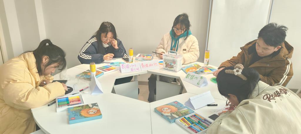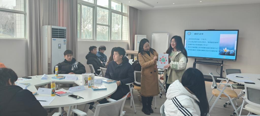 杨小玉先给同学们介绍了“曼陀罗”绘画的起源、功效、材料准备和绘制流程,接着大家在冥想音乐中入静、放松,全身心投入到作品创作当中。大家挑选自己喜欢的颜色,把个人的感受、情绪和联想用画笔描绘在“曼陀罗”画纸上,更深入地理解自己,看见自己,体验一场专属于自己的心灵之旅。