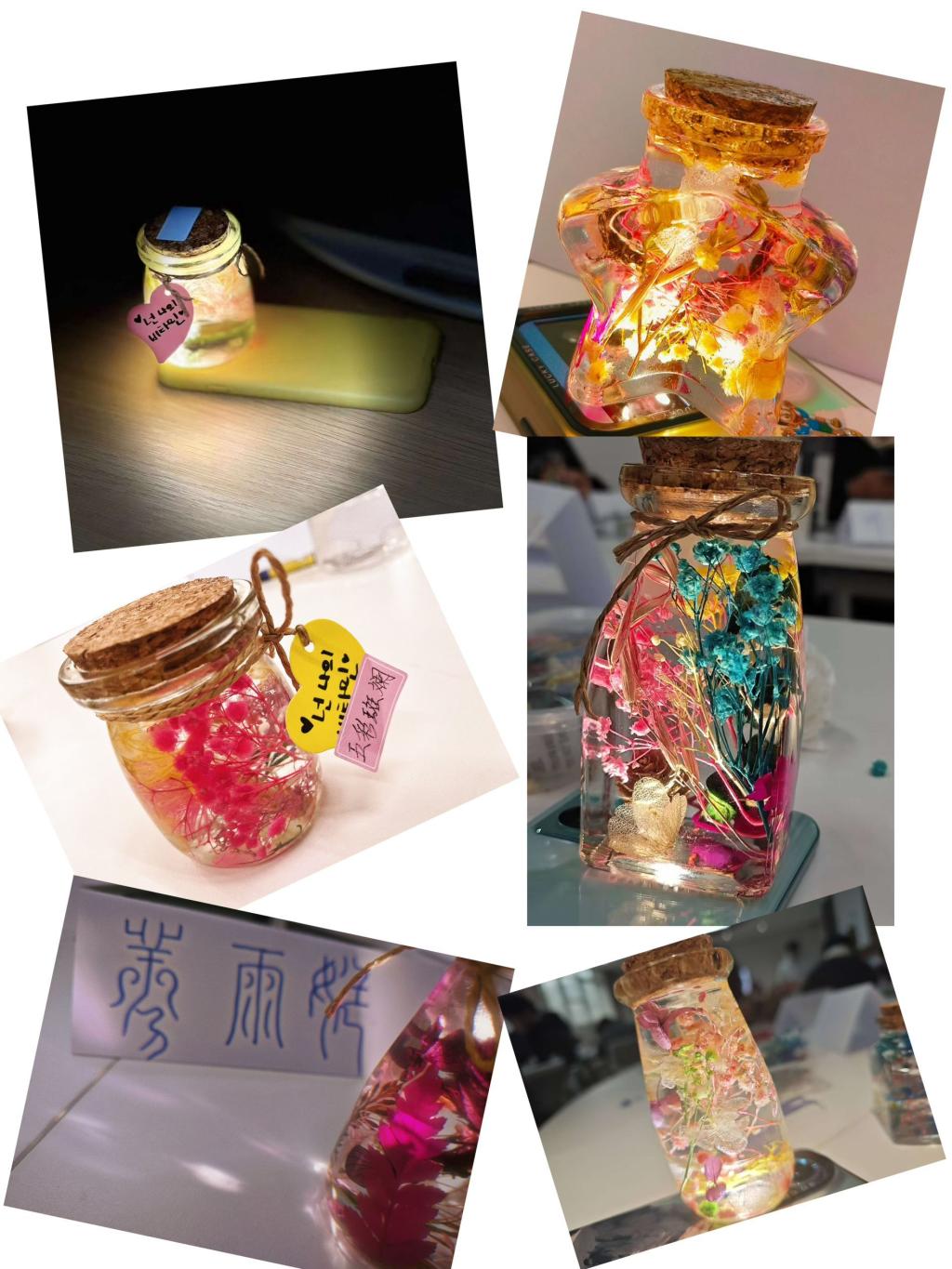 活动分为“放松练习”、“浮游花瓶制作”和“交流分享”三个环节。活动伊始,同学们在舒缓的背景音乐中冥想放松身心,专注于当下。在制作浮游花瓶的过程中,大家选择自己喜欢的干花材料,自由发挥创意,将干花进行搭配组合,仔细修剪花材,精心调整花材位置,使花材在瓶中富有层次感,随着浮游花专用油的缓慢注入,花材呈现出灵动轻盈的视觉效果。原本空空如也的玻璃瓶中,出现了漂浮绽放的小世界,光线透过,令人怦然心动,心情也如瓶中世界一样变得明媚。