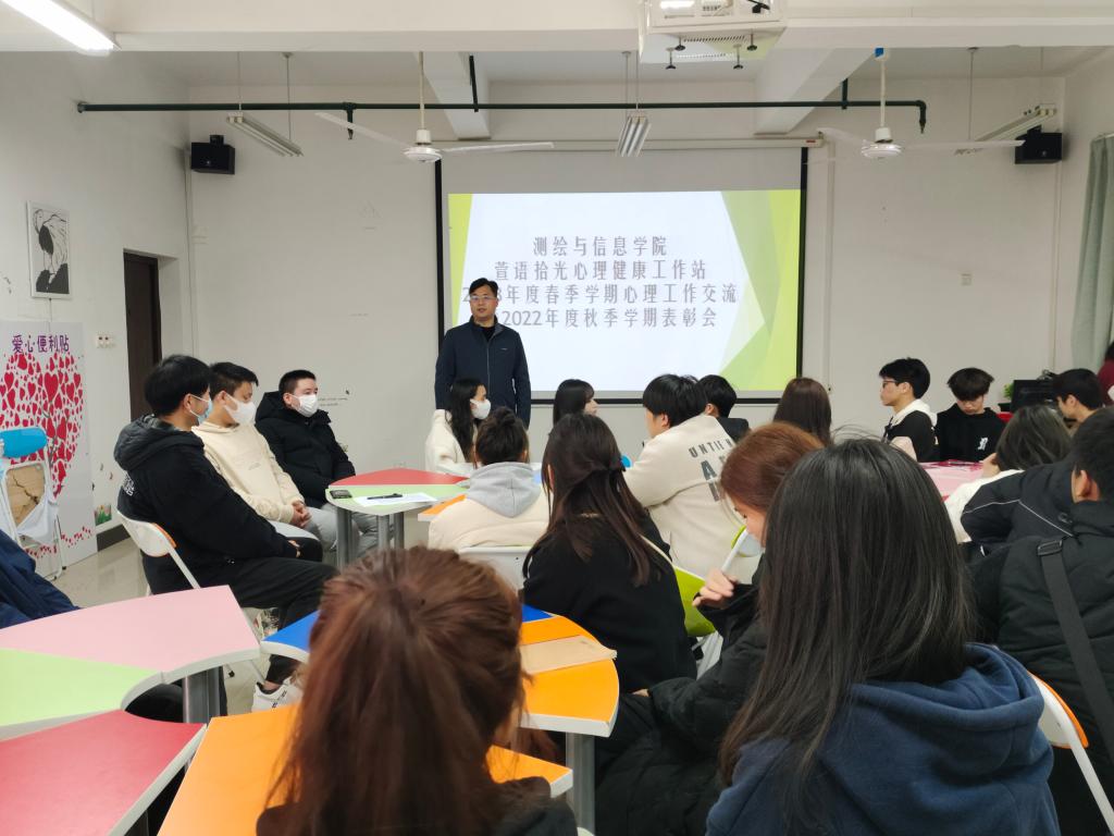 2月28日中午,测绘与信息公司“萱语拾光”心理健康工作站在长江楼1027活动室召开了2023年度春季学期心理工作交流会暨2022年度秋季学期表彰会。2021级心理委员代表和2022级全体心理委员参加会议,心理健康工作站站长黄宝玉出席会议,会议由指导老师杨小玉主持。